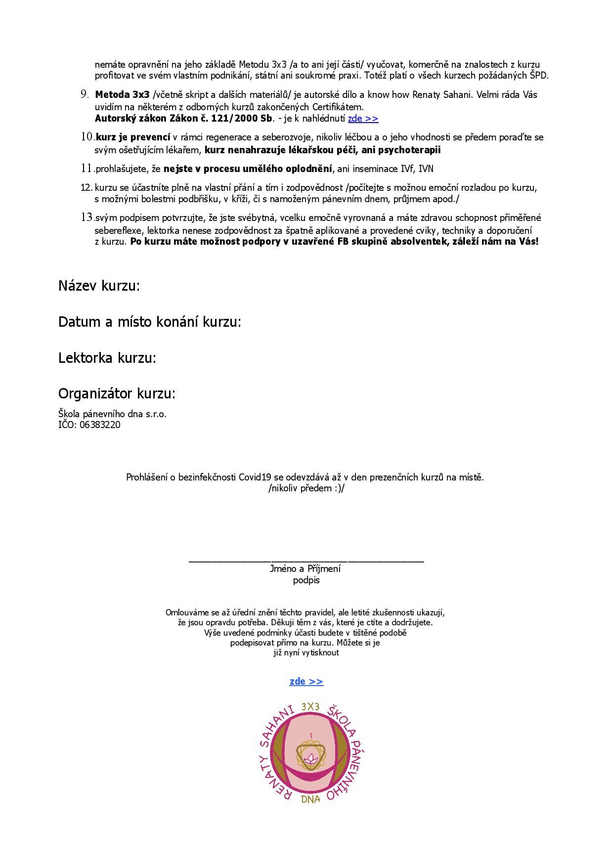 - svým podpisem potvrzujte, že jste svébytná, vcelku emočně vyrovnaná a máte zdravou schopnost přiměřené sebereflexe, lektorka nenese zodpovědnost za špatně aplikované a provedené cviky, techniky a doporučení z kurzu. Po kurzu máte možnost podpory v uzavřené FB skupině absolventek, záleží nám na Vás!